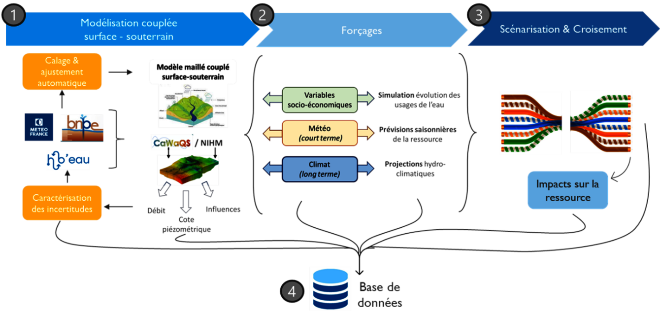 Dans un contexte de changement climatique et de diminution de la disponibilité en eau, il apparait important de fournir aux gestionnaires et grands préleveurs d’eau des outils permettant de simuler et de piloter la gestion de la ressource en eau en intégrant les facteurs comme le climat et son évolution à différents horizons temporels, les besoins en eau associés aux activités anthropiques et le bon fonctionnement des milieux aquatiques.