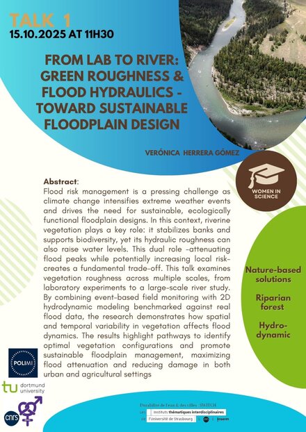Flood risk management is a pressing challenge as climate change intensifies extreme weather events and drives the need for sustainable, ecologically functional floodplain designs. In this context, riverine vegetation plays a key role: it stabilizes banks and supports biodiversity, yet its hydraulic roughness can also raise water levels. This dual role -attenuating flood peaks while potentially increasing local risk- creates a fundamental trade-off. This talk examines vegetation roughness across multiple scales, from laboratory experiments to a large-scale river study. By combining event-based field monitoring with 2D hydrodynamic modeling benchmarked against real flood data, the research demonstrates how spatial and temporal variability in vegetation affects flood dynamics. The results highlight pathways to identify optimal vegetation configurations and promote sustainable floodplain management, maximizing flood attenuation and reducing damage in both urban and agricultural settings.
