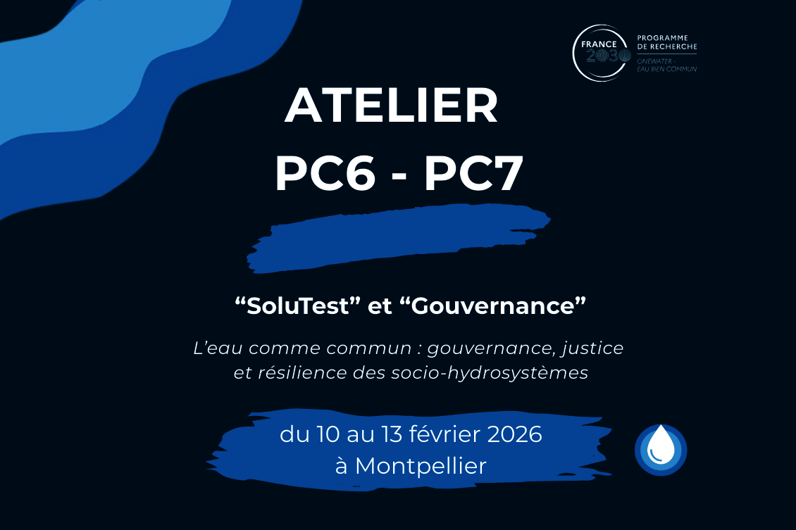 Les projets SoluTest (PC6) et Gouvernance (PC7) du PEPR OneWater organiseront un atelier conjoint sur la gouvernance, la justice et la résilience des socio-hydrosystèmes. Chercheur·euses, acteur·ices des politiques de l’eau, représentant·es associatifs et acteur·ices socio-économiques sont invité·es à croiser leurs regards sur la contribution des nouveaux modes de gouvernance à la durabilité et à l’adaptabilité des territoires, avec un focus sur l’intégration des non-humains. L’atelier permettra de confronter les cadres conceptuels élaborés lors de la première phase des projets aux réalités de terrain et de préparer la seconde phase du PEPR, plus ancrée dans les territoires.