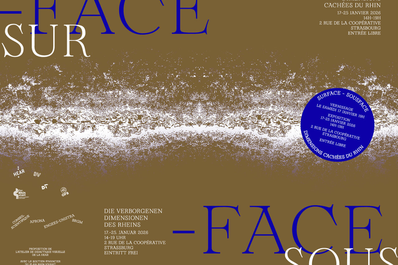 Les étudiantes de 4ᵉ année de l’Atelier de Didactique visuelle de la HEAR et encadré par Aurélie Gasche, présentent leur exploration de la nappe phréatique rhénane à travers le projet Surface-Sousface : quatre approches mêlant science et sensibilité. Le vernissage aura lieu le 17 janvier à 19h au 2 rue de la Coopérative – Port du Rhin. L’exposition sera visible les après-midis jusqu’au 25 janvier, puis à la HEAR le 6 février lors de la journée portes ouvertes (1 rue de l’Académie, salle 30). Ce projet, soutenu par le plan Rhin vivant et l’Office Français de la Biodiversité, rend visible ce système souterrain vital et complexe.
